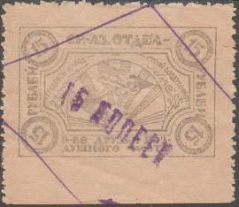 1924 г. Третий вспомогательный республиканский выпуск. Фиолетовая надпечатка нового номинала ручным штампом на марках Средне-Азиатского отдела ОДВФ первого выпуска. Шрифт надпечатки мелкий.