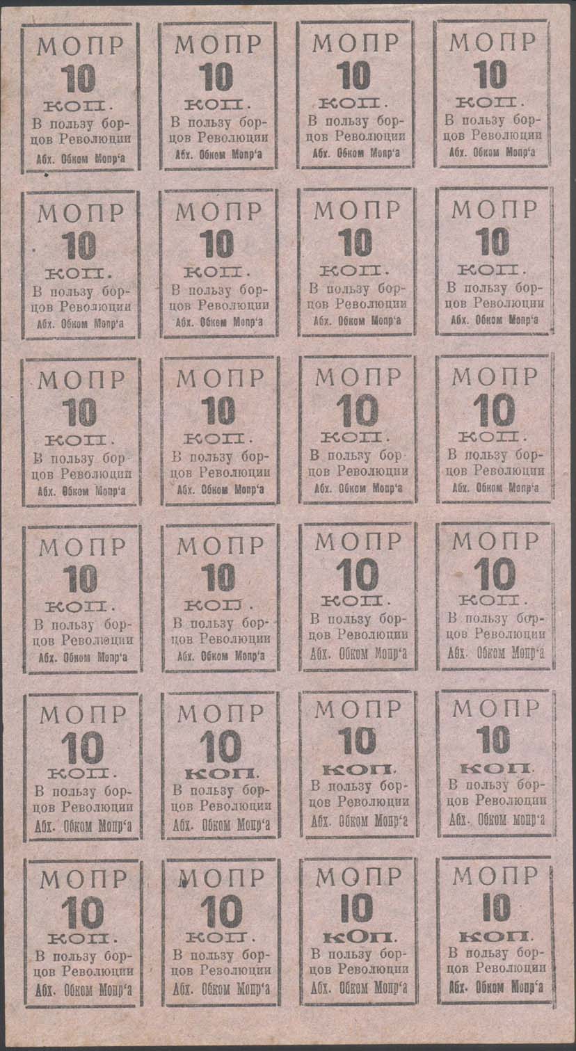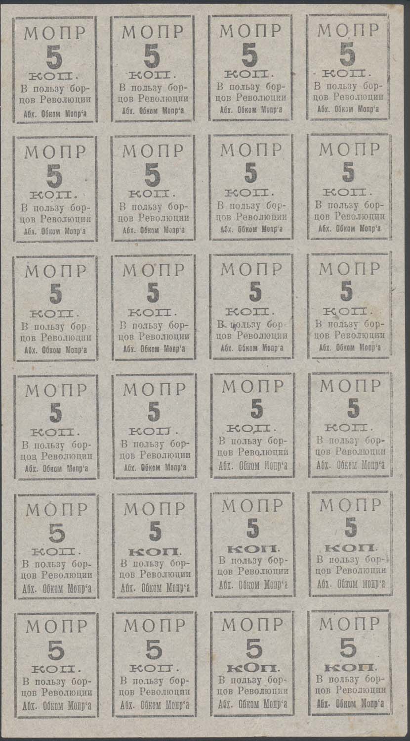 1932 г. Разм. рамки 29 х 36 мм. Одноцветная печать тонкой бумаге различных цветов. В двойной прямоугольной рамке центре номинал. Сверху аббревиатура «МОПР». Внизу текст в три строки: «В пользу борцов революции. Абх[азский]. Обком МОПРа».