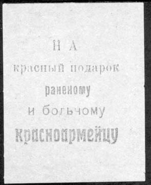 1920 г. 11-18.01.1920 г. Разм. 45 х 57 мм. Одноцветная печать на сероватой бумаге. Текст в пять строк: «На красный подарок раненому и больному красноармейцу».