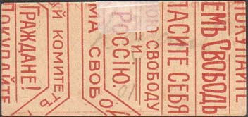1917 г. 18.07.1917 г. Разм рамки 55 х 24 мм. Одноцветная печать на бумаге различных цветов. В двойной прямоугольной рамке в центре текст в три строки: «Свободные граждане русской земли! Жертвуйте в фонд «Героев 18 июня 1917 года»». По периметру между рамками текст: «Казанский Народный Комитет распространения «Займа Свободы»».