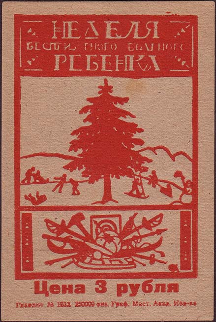 1925(?) г. Листок разм. 73 х 111 мм. Одноцветная печать на розово-серой бумаге. В центре в прямоугольной рамке разм. 63 х 90 мм елка, горки и играющие дети. Сверху текст в три строки: «Неделя беспризорного и больного ребенка». Внизу разнообразный спортивный инвентарь. Внизу под рамкой номинал и выходные данные мелким шрифтом.