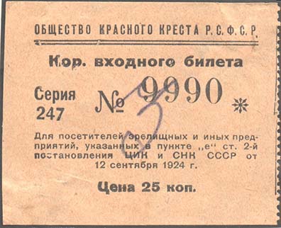 1924(?) г. Разм. 102 х 55 мм. Одноцветная печать на серой бумаге. Слева односторонняя зубц. В рамке по углам номинал. Текст: «Общество Красного Креста РСФСР Входной билет Серия ... №... Для посетителей зрелищных и иных мероприятий, указанных в пункте «е» ст. 2-й постановления ЦИК и СНК СССР, от 12 сентября 1924 г. Цена ... коп. Без штампа предприятия с указанием даты выдачи билета - билет не действителен». Справа контрольный талон, отделяемый с помощью перфорации. Слева корешок, на котором текст, аналогичный тексту на квитанции.