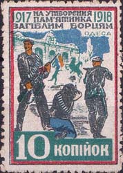 1924(?) г. Разм. рамки 26,5 х 38 мм. Трехцветная печать на белой бумаге. Нерегулярная зубц. В центре различные рисунки. Сверху текст в пять строк на украинском языке: «На создание памятника погибшим борцам 1917-1918 Одесса». Внизу номинал.