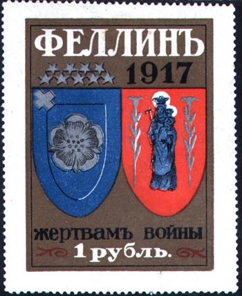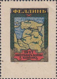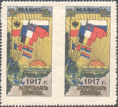 1917 г.   Многоцветная печать на бумаге различных цветов. Зубц. 11 1/2. С клеем. В прямоугольной рамке в центре различные сюжеты. Текст: «Феллин - жертвам войны 1917».