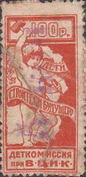 1924 г. Вертикальная снизу вверх фиолетовая надпечатка нового номинала в виде текста: «5 коп.» крупным шрифтом на марках первого всесоюзного выпуска Детсомиссии при ВЦИК.