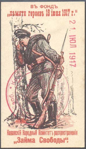 1917 г.   Разм. 49 х 85 мм. Двухцветная печать на белой бумаге. Раненый солдат с винтовкой, присло-нившийся к дереву. Сверху текст в две строки: «В фонд памяти героев 18 июня 1917 г.». Внизу текст в две строки: «Казанский Народный Комитет распространения «Займа Свободы»». По углам знака разграничительные линии.