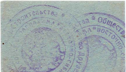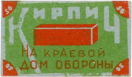 1930(?) г. Разм. 54 х 30 мм. Двухцветная печать на серо-зеленоватой бумаге. В центре различные рисунки. Текст: «Кирпич на краевой дом обороны». По углам номинал. На обороте фиолетовый оттиск круглой контрольной печати с неразборчивым текстом.