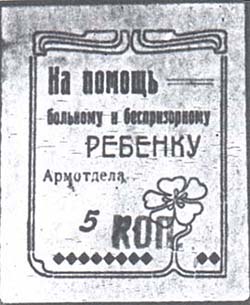 1924 г.   Фиолетовая надпечатка нового номинала в виде текста: «Коп.» на марках предыдущего выпуска ручным штемпелем.