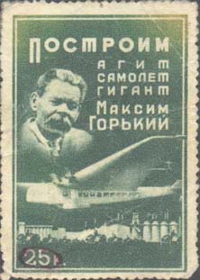 1933 г.  Всесоюзный выпуск. Разм. рамки 38 х 48  мм. Одноцветная двухсторонняя печать на белой бумаге. Зубц. 12 х 12 1/2. На лицевой стороне в прямоугольной рамке слева сверху портрет А.М.Горького, ниже самолет над аграрно-индустриальным  пейзажем. Справа сверху текст в шесть строк: «Построим агитсамолет гигант Максим Горький». В левом нижнем углу номинал. На оборотной стороне марки предупредительная надпись вертикально сверху вниз в три строки: «Распространение агитмарок производится исключительно на добровольных началах».