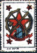 1931 г. Разм. рамки 23 х 32,5 мм. Многоцветная печать на бумаге различных цветов c мелованным верх-ним слоем, тонированным в различные цвета. В двойной прямоугольной рамке в центре эмблема ОСОАВИАХИМ. По углам пятиконечные звезды. Внизу под рамкой слева выходные данные мелким шрифтом: «А 10. 25.-36.». На оборотной стороне оттиск штампа различных цветов разм. 26 х 10 мм. В штампе слева текст в три строки: «Дор[ожный]. Совет Осо-Авиахима С.-К.ж.д.». Справа крупным шрифтом номинал: «10 к.».