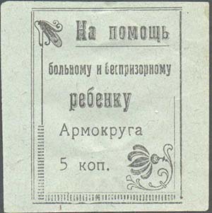1924 г.   Разм. рамки 36 х 46 мм. Одноцветная печать на желтоватой бумаге различных цветов. В прямо-угольной рамке с растительным орнаментом текст в четыре строки: «На помощь больному и бес-призорному ребенку Армокруга». Внизу номинал.