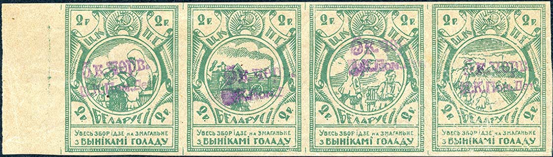 1924 г. Фиолетовая надпечатка нового номинала в виде: «5 к. черв. Ц.К. Пом. Дет.» на марках выпуска ЦКПГ Белоруссии.