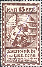 1924 г. Второй республиканский выпуск. Разм. рамки 23 х 36,5 мм. Одноцветная печать на белой (оттенки) бумаге. Зубц. 11 1/2. С клеем. Рисунок предыдущего выпуска, но внизу добавлен текст на белорусском языке: «Принудительное распространение воспрещается».