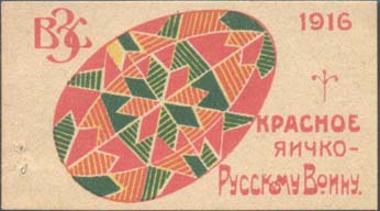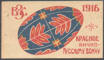 1916 г. Разм. 57 х 32 мм. Трехцветная печать на сероватой плотной бумаге. Серия виньеток с одинаковым рисунком: пасхальное яйцо с различным орнаментом. Сверху слева буквы «ВЗС», справа дата: «1916». Справа внизу текст в три строки: «Красное яичко – Русскому Воину».