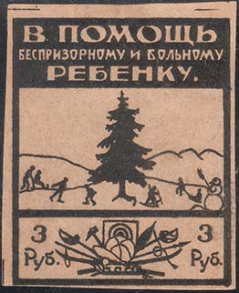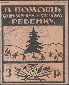 1926(?) г. Разм. 43 х 53 мм. Одноцветная печать на желтоватой бумаге. В центре в толстой прямоугольной рамке разм. 40 х 48 мм на фоне горок ель и играющие дети. Сверху на сплошном фоне текст в три строки: «В помощь беспризорному и больному ребенку». Внизу в отдельной рамке спортивный различный спортивный инвентарь и номинал.