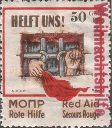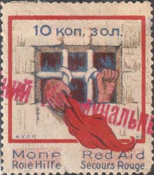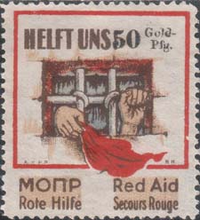 1924 г. Разм. по перфорации ≈ 38 х 42 мм. Многоцветная печать на желтоватой бумаге. Зубц. 11. С клеем. В прямоугольной рамке разм. 33 х 30,5 мм эмблема МОПР. Внизу аббревиатура на русском, немецком, английском и французском языках: «МОПР». Внизу с внутренней стороны рамки выходные данные мелким шрифтом: «А.Х.Р.Р. Н.Н.».