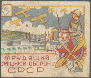 | Разм. рамки 35 х 45 мм. В центре по диагонали текст на украинском языке в две строки: «Укрепляй оборону С.С.С.Р.». В левом верхнем углу 10-копеечная монета. Внизу танк и самолеты над городом. | |||||