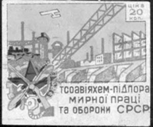 | Разм. рамки 45 х 26 мм. Самолет над заводом и гидроэлектростанцией, слева внизу подъемный кран и эмблема ОСОАВИАХИМ. Справа внизу текст в три строки на украинском языке: «Осоавиахим - опора мирного труда и обороны С.С.С.Р.». В правом верхнем углу номинал. | |||||
