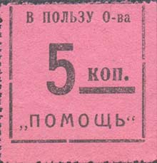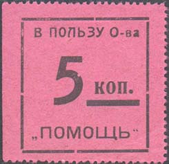 1924(?) г. Разм. рамки 32 х 33 мм. Одноцветная печать на розово-фиолетовой бумаге. Зубц. 11 1/2. В центре номинал. Сверху текст: «В пользу О-ва». Внизу продолжение текста: ««Помощь»».
