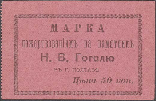 1906(?) г. Листок из квитанционной книжки 84 х 57 мм. Одноцветная печать на бумаге различных цветов. Левосторонняя зубц. 11 1/2. В центре в прямо-угольной рамке из декоративных элементов разм. 73 х 46 мм текст в четыре строки: «Марка пожертвованиям на памятник Н.В.Гоголю в Полтаве». В правом нижнем углу номинал прописью.