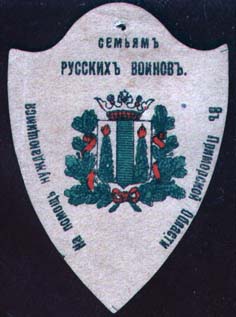 1916 г. Виньетка в виде щитка сложной формы разм. Разм. 37 х 52 мм. Одноцветная и трехцветная печать на светло-серой бумаге. В центре герб Приморской области. Сверху текст в две строки: «Семьям русских воинов». Слева и справа текст: «На помощь нуждающимся в Приморской области».