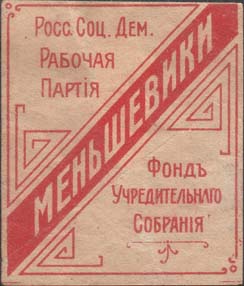 1917 г. Разм. 54 х 59 мм. Одноцветная печать на серо-желтой бумаге. В центре в прямоугольной рамке разм. 42 х 49 мм в левом верхнем углу текст в три строки: «Росс[ийская]. Соц[иалистическая]. Дем[ократическая]. Рабочая Партия». По диагонали слева направо снизу вверх текст: «Меньшевики». В правом …