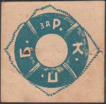 1917 г. Разм. рмки 39 х 39 мм. Одноцветная печать на бумаге различных цветов. В двойной прямоугольной рамке в центре текст в три строки на татарском языке арабским шрифтом: «В пользу национальных школ». По периметру между рамками текст на татарском языке арабским шрифтом.
