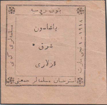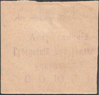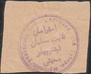 1917 г. Разм. 50 х 42 мм. Одноцветная печать на кремовой бумаге. В центре фиолетовый оттиск круглой печати союза диаметром 36 мм. На печати в двойной круглой рамке текст в четыре строки на татарском языке арабским шрифтом. По внутреннему периметру рамки текст: «Астраханский Губерн[ский]. Мусульма…