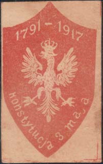 1917 г. Разм. 34 х 53 мм. Одноцветная печать на плотной желтоватой бумаге. В центре щиток сложной формы в центре которого герб Польши. Сверху даты: «1791 - 1917». Внизу текст на польском языке: «Конституция 3 мая».