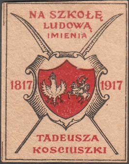1917 г. Разм. рамки 42 х 55 мм. Двухцветная печать на толстой желтоватой бумаге. В прямоугольной рамке в центре картуш на фоне скрещенных пик. На картуше в декоративной рамке гербы Польши и Литвы. Слева дата: «1817». Справа дата: «1917». Сверху текст в три строки на польском языке: «На народную ш…