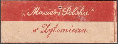 1917 г. Разм. 68 х 25 мм. Одноцветная печать на белой бумаге. Виньетка в виде польского флага. Текст в две строки на польском языке.