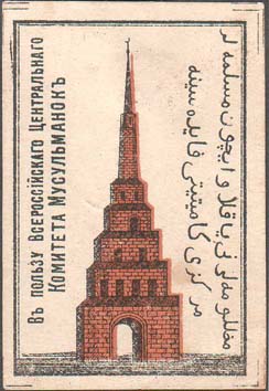 1917 г. Разм. 40 х 60 мм. Двухцветная печать на белой бумаге. В двойной прямоугольной рамке разм. 35,5 х 54 мм в центре ступенчатая башня с полумесяцем на шпиле. Слева текст вертикально в две строки: «В пользу Всероссийского Центрального Комитета Мусульманок». Справа вертикально текст в две строк…