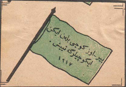 1917 г. Разм. 70 х 45 мм. Двухцветная печать на сероватой бумаге. В центре зеленое знамя. На полотнище знамени текст в две строки на татарском языке арабским шрифтом: «Земля и Воля. 1917 г». По углам знака разграничительные линии.