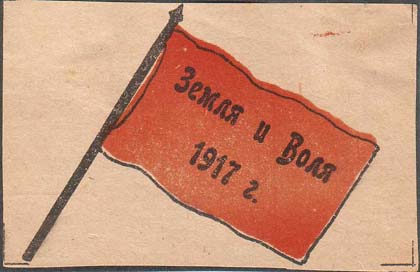 1917 г. Разм. 71 х 45 мм. Двухцветная печать на сероватой бумаге. В центре красное знамя. На полотнище знамени текст в четыре строки: «Земля тому, кто сам работает на ней. 1917». По углам знака разграничительные линии.