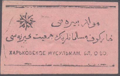 1917(?) г. Разм. 68 х 42 мм. Одноцветная печать на тонкой розовой бумаге. В центре между двух горизонтальных линий текст в две строки на татарском(?) языке арабским шрифтом. В левом верхнем углу декоративный элемент в виде многолучевой звезды. Внизу текст: «Харьковское мусульман[ское]. бл[аготвор…