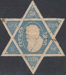 1912(?) г. Виньетка в форме шестиконечной звезды разм. 36 х 41 мм. Одноцветная печать с тиснением на тонкой белой бумаге. В центре портрет Теодора Герцля. Тексты на русском и идиш.