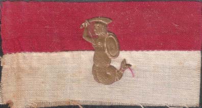 1917(?) г. Составной знак. Виньетка в виде флага Польши сшитая из двух частей материи разм. ≈ 68 х 35 мм. В центре наклеен герб Варшавы(?).