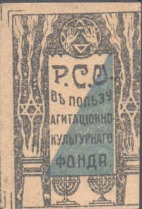 1924(?) г. Разм. рамки 31 х 47 мм. Двухцветная печать на плотной желтоватой бумаге. В прямоугольной рамке в центре текст в четыре строки: «Р.С.О. В пользу агитационно-культурного фонда». По углам знака разграничительные линии.