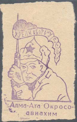 1929 г. Разм. 36 х 63 мм. Одноцветная печать на белой бумаге. В центре красноармеец с винтовкой. Сверху на ленте текст: «Крепи оборону С.С.С.Р.». Ниже текст в две строки: «Алма-Ата Окросоавиахим». Внизу декоративный элемент из горизонтальных штрихов.