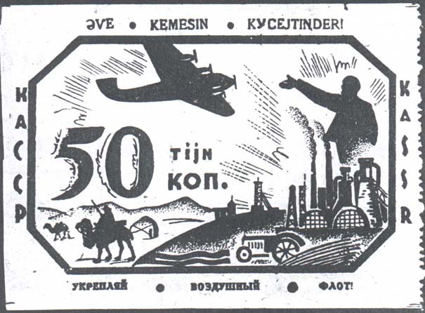 1932 г. Первый республиканский выпуск. Одноцветная печать на желтоватой бумаге. Различные рисунки. Текст на русском и казахском (латинским шрифтом) языках: «Укрепляй воздушный флот!».