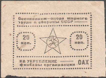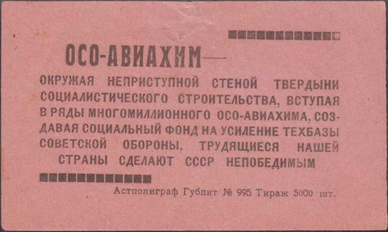 1930(?) г. 10 июля. Разм. 92 х 56 мм. Одноцветная печать на розово-серой бумаге. В центре текст в семь строк: «ОСО-АВИАХИМ – окружая неприступной стеной твердыни социалистического строительства, вступая в ряды многомиллионного осоавмахима, создавая социальный фонд на усиление техбазы советской обо…