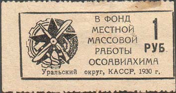 1930 г. Разм. 62 х 32 мм. Одноцветная печать на бумаге различных цветов. Зубц. 11 1/2. В прямоугольной рамке разм. 52,5 х 22,5 мм в центре текст в пять строк: «В фонд местной массовой работы ОСОАВИАХИМа». Слева эмблема ОСОАВИАХИМ. Справа номинал. Внизу текст: «Уральский округ, КАССР, 1930 г.».