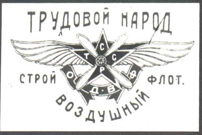 1925(?) г. Разм. 59 х 38 мм. Двухцветная печать на белой бумаге. В центре значок ОДВФ ТССР. Сверху текст: «Трудовой народ». Внизу продолжение текста: «Строй воздушный флот».