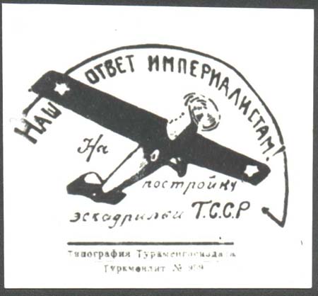 1927(?) г. Разм. 66 х 60 мм. Одноцветная печать на белой бумаге. В центре самолет-моноплан, летящий вправо. Сверху полукругом текст: «Наш ответ империалистам». В центре текст в три строки: «На постройку эскадрильи Т.С.С.Р». Внизу мелким шрифтом выходные данные в две строки: «Типография Туркменгос…