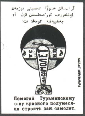 1925(?) г. Разм. 48 х 66 мм. Трехцветная печать на белой бумаге. В центре самолет и красный полумесяц, вписанные в круглую рамку. На фюзеляже и крыльях самолета текст: «Жертвуйте на самолет Т.О.К.П.». Сверху текст в три строки на туркменском языке арабским шрифтом. Внизу текст в три сроки: «Помог…