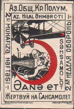 1930 г. Разм. рамки 38,5 х 55 мм. Двухцветная печать на желтоватой бумаге. В двойной прямоугольной рамке сверху самолет-биплан, летящий влево. В центре красный полумесяц и медсестра, поддерживающая раненого, на фоне индустриального пейзажа. По периметру рамки текст на русском и азербайджанском (л…