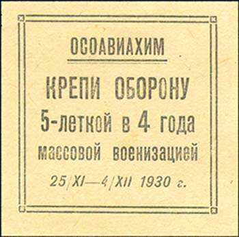 1930 г. 25.11.-04.12.1930 г. Разм. рамки 53 х 53 мм. Одноцветная печать на бумаге различных цветов. В двойной прямоугольной рамке с декоративными элементами по углам сверху аббревиатура с подчеркиванием: «ОСОАВИАХИМ». Ниже текст в четыре строки: «Крепи оборону 5-леткой в 4 года, массовой военизаци…