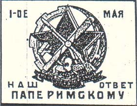 1930 г. 01.-03.05.1930 г. Разм. 51 х 40 мм. Многоцветная печать на белой бумаге. На сплошном фоне эмблема ОСОАВИАХИМ. Сверху текст: «1-ое мая». Внизу текст в две строки: «Наш ответ Папе Римскому».