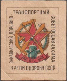 1931 г. Разм. рамки 29 х 37 мм. Многоцветная печать на кремовой бумаге. В прямоугольной рамке в центре эмблема ОСОАВИАХИМ. По внутреннему периметру рамки текст: «Закавказский дорожно-транспортный совет Осоавиахима. Крепи оборону СССР».