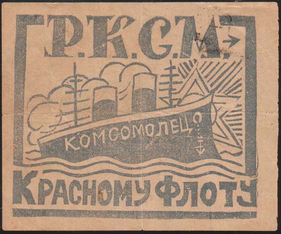 1923 г. Разм. рис. 80 х 66 мм. Одноцветная печать на желтоватой бумаге. В центре теплоход «Комсомолец» на фоне пятиконечной звезды и облаков. Сверху текст: «РКСМ – Красному Флоту». На обороте фиолетовый оттиск круглой контрольной печати диаметром 35 мм и номинал: «1 руб.».